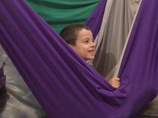 A sensory swing or hammock provides controlled, rhythmic movement that stimulates the vestibular system in the inner ear.